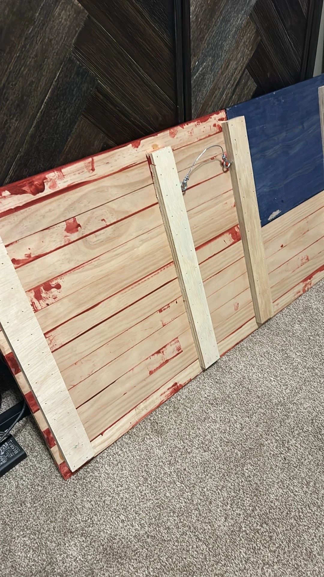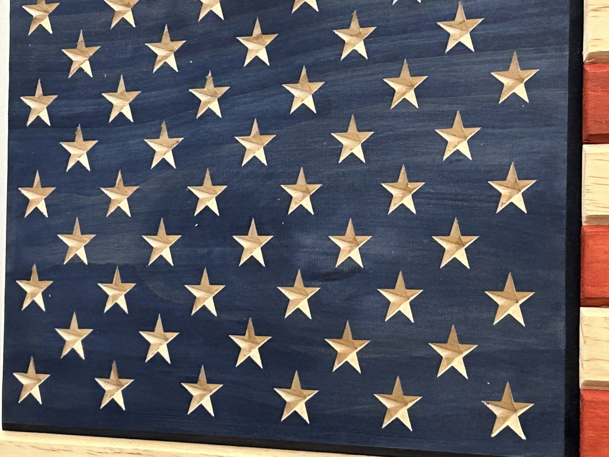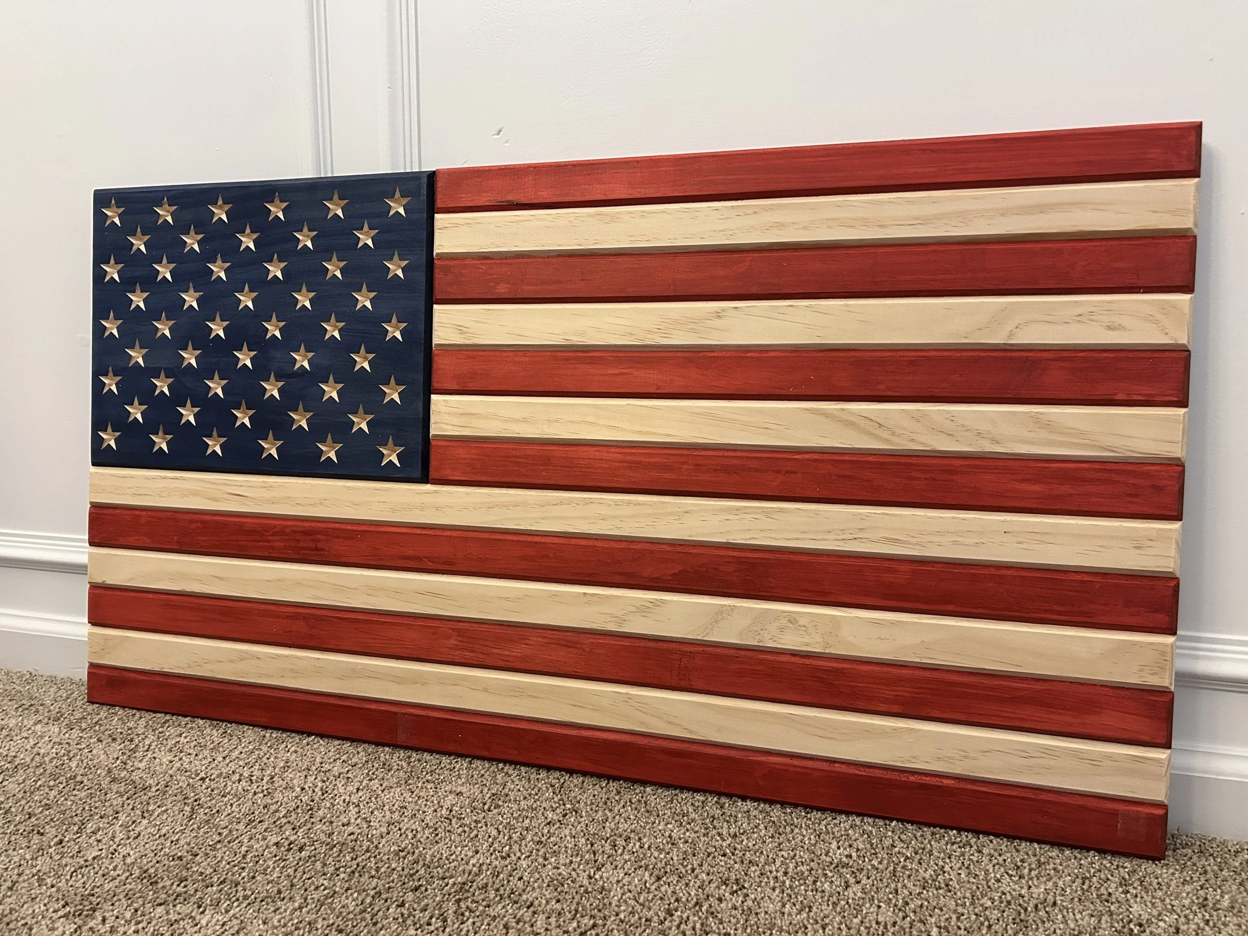 This American Flag made is made out of high quality select pine and measures 19 × 37 inches. Take a look at those beautifully engraved stars in the union and chamfered edges on the stripes. Two coats of stain bring out a deep hue of the red and blue combined with two coats of finish creates a beautiful, clear satin sheen. Intended for indoor use. This flag looks great!